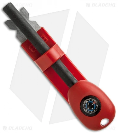 The Grand Fireball Flint & Striker from Bushcraft features a comfortable handle with a small liquid filled button compass on the flint and striker. The flint and striker of slide and lock together so removing the need for the annoying string.