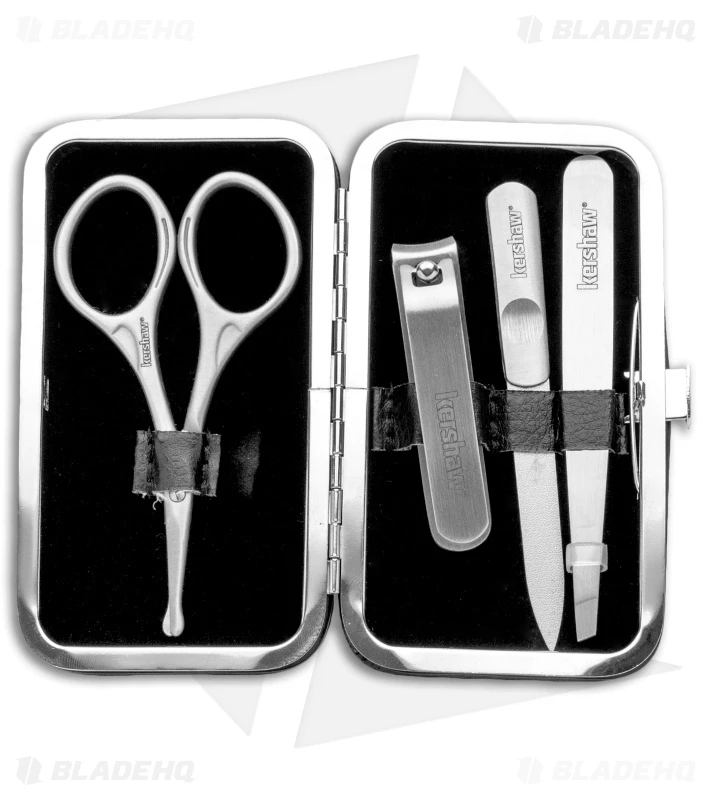 The Kershaw Manicure Set is a classy personal nail care kit. It includes nail clippers, cuticle scissors, a nail file and tweezers. Each tool is made of stainless steel in a satin finish. Comes complete with in a matching case.