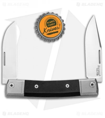 This model of the LionSteel BestMan has both a clip point and wharncliffe blade. The handle has ebony wood inserts with titanium bolsters.