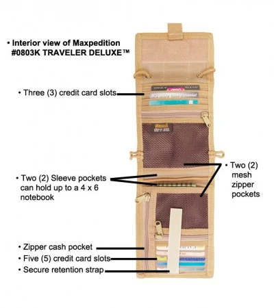 The Traveler Deluxe Passport / ID carrier holds your most important travel documents close to the body. An extra large ID window provides the options of showing your identification. Two slip pockets behind the window and two slip pockets on the back all hold cellphone, cash, tickets, travel documents. Elastic band on back will hold pens or flashlights. Small clear pocket in the rear can hold phone cards, itineraries, business cards, or notes. In addition, the Deluxe Traveler flips open to reveal five (5) more slip pockets, two (2) zippered pockets, and credit card organizer.