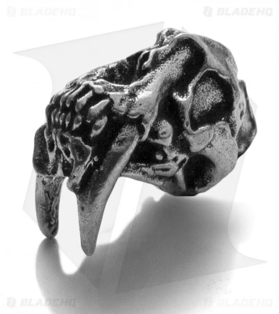 This Sabertooth Skull Bead is pewter and has a 3/16″ diameter center hole. The Schmuckatelli lanyard bead is just the way to dress up your knives and gear. Be sure to click on the pictures above for a larger, detailed look at this cool skull bead.
