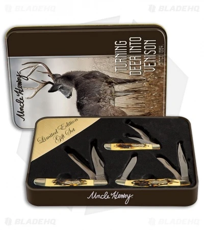 This limited edition Uncle Henry Gift Set from Schrade offers 3 classic pocket knife designs for one great price. Add an instant upgrade to your knife collection with the Uncle Henry Gift Set.