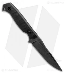 - Black G-10, textured handle with full tang construction featuring a finger hole.