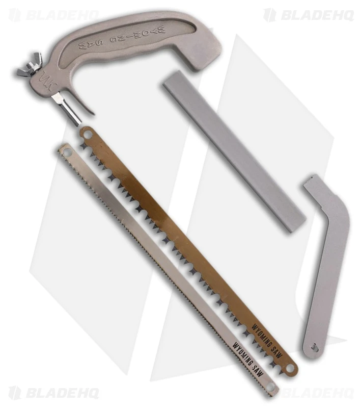 The 11 1/8″ heat-treated wood and bone blades come together to weigh a mere 16 ounces when housed in the camouflage case. This saw is equipped with a finger guard to shield knuckles against bruising. The saw is quickly assembled with a powder-coated stainless steel frame and aluminum handle, and the full frame makes sawing more efficient than loose-end blades.